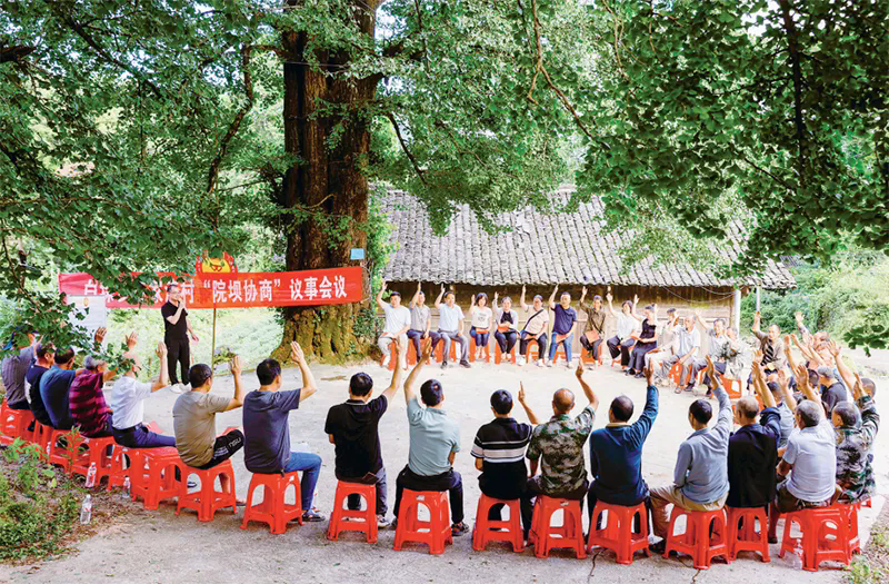 近年來,貴州省黔東南苗族侗族自治州施秉縣政協(xié)以“有事好商量,眾人的事情眾人商量”為理念,在群眾家門口搭建“開展院壩協(xié)商·建設(shè)和美鄉(xiāng)村”協(xié)商議事平臺,推動民主協(xié)商向基層延伸。圖為2024年7月4日,在施秉縣白垛鄉(xiāng)石家灣村,縣政協(xié)委員、村“兩委”成員、村民代表圍繞移風(fēng)易俗、美化環(huán)境、保護生態(tài)、助力和美鄉(xiāng)村建設(shè)開展協(xié)商。 人民圖片 磨桂賓/攝